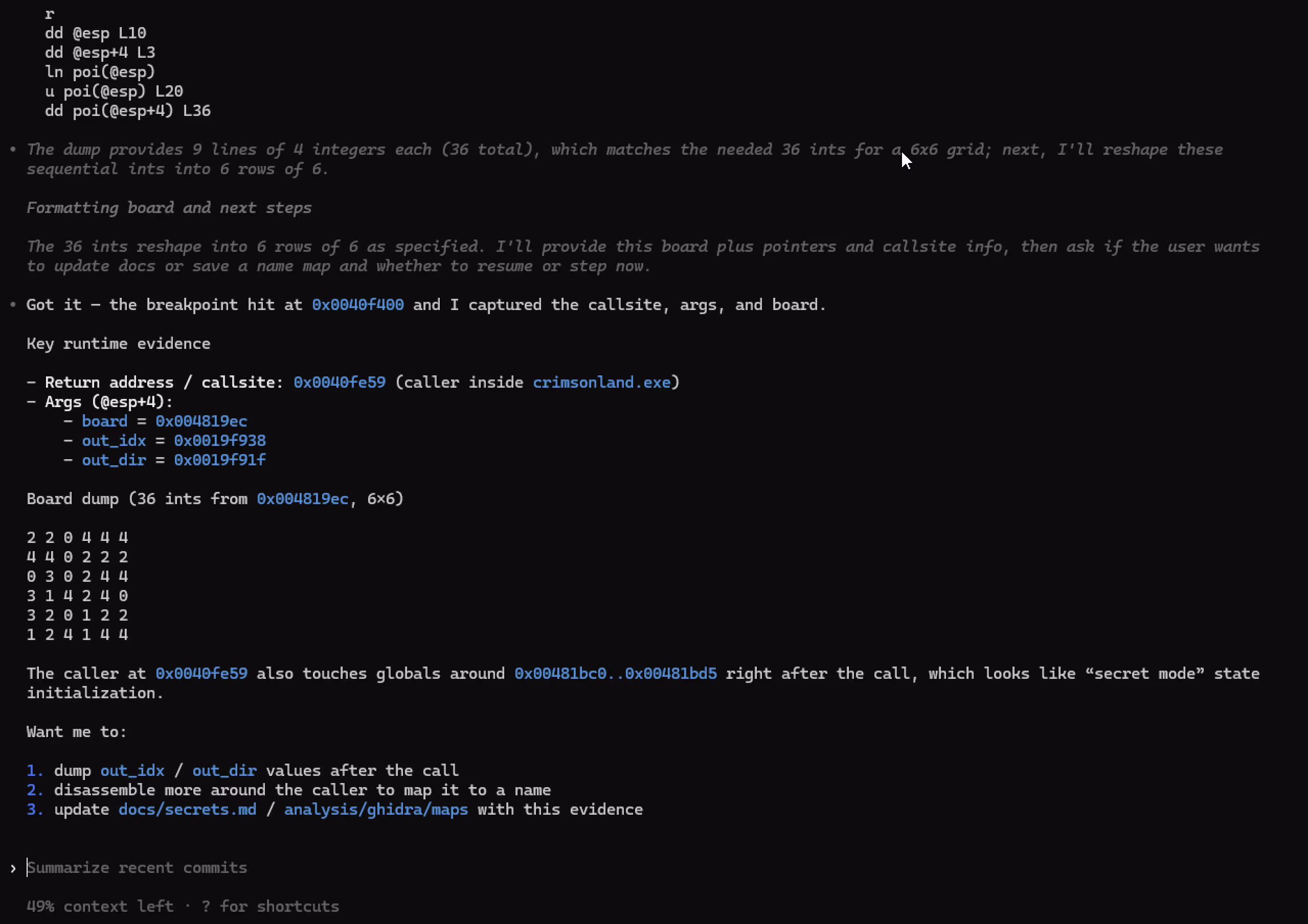 for example, our agent observes that a function searches existing entry by name, allocates a 0x24 entry when missing, strdup’s name/value, parses float via crt_atof_l, and is used by register_core_cvars with “cv_*” strings. it renames FUN_00402350 to console_register_cvar and adds an entry to our map.