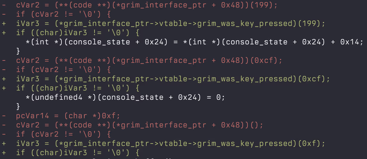 so our starting point is missing names + missing types + missing calling conventions + c++/com indirection courtesy of directx 8 and grim.dll. everything is “object pointer → vtable → function pointer call”. the usual decompiler output looked somewhat like this: